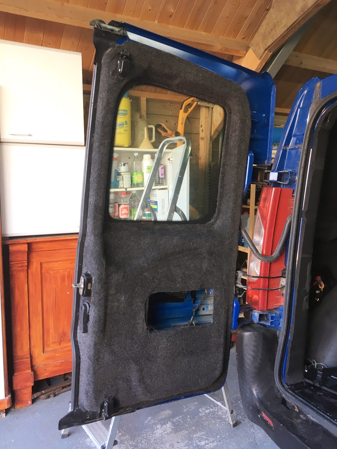 Twee dagen bezig geweest met het bekleden van de auto, samen met mijn moeder. De bekleding is wat je standaard in auto’s vind en de stof is rekbaar, slijtvast en goed schoon te houden. Ik had een mooie video over gevonden van een camperbouwer in de UK, waar de beste man het helemaal alleen deed. Heb ‘m denk ik wel 10x bekeken. Maar de praktijk is toch wat weerbarstiger, alleen gaat echt niet. Samen met mijn moeder ging het gelukkig en we hebben het er netjes in gekregen. Zelfs de plekken waar al die Armaflex niet helemaal strak was werd goed. Begonnen met de deuren om te oefenen en daarna de grotere oppervlaktes.