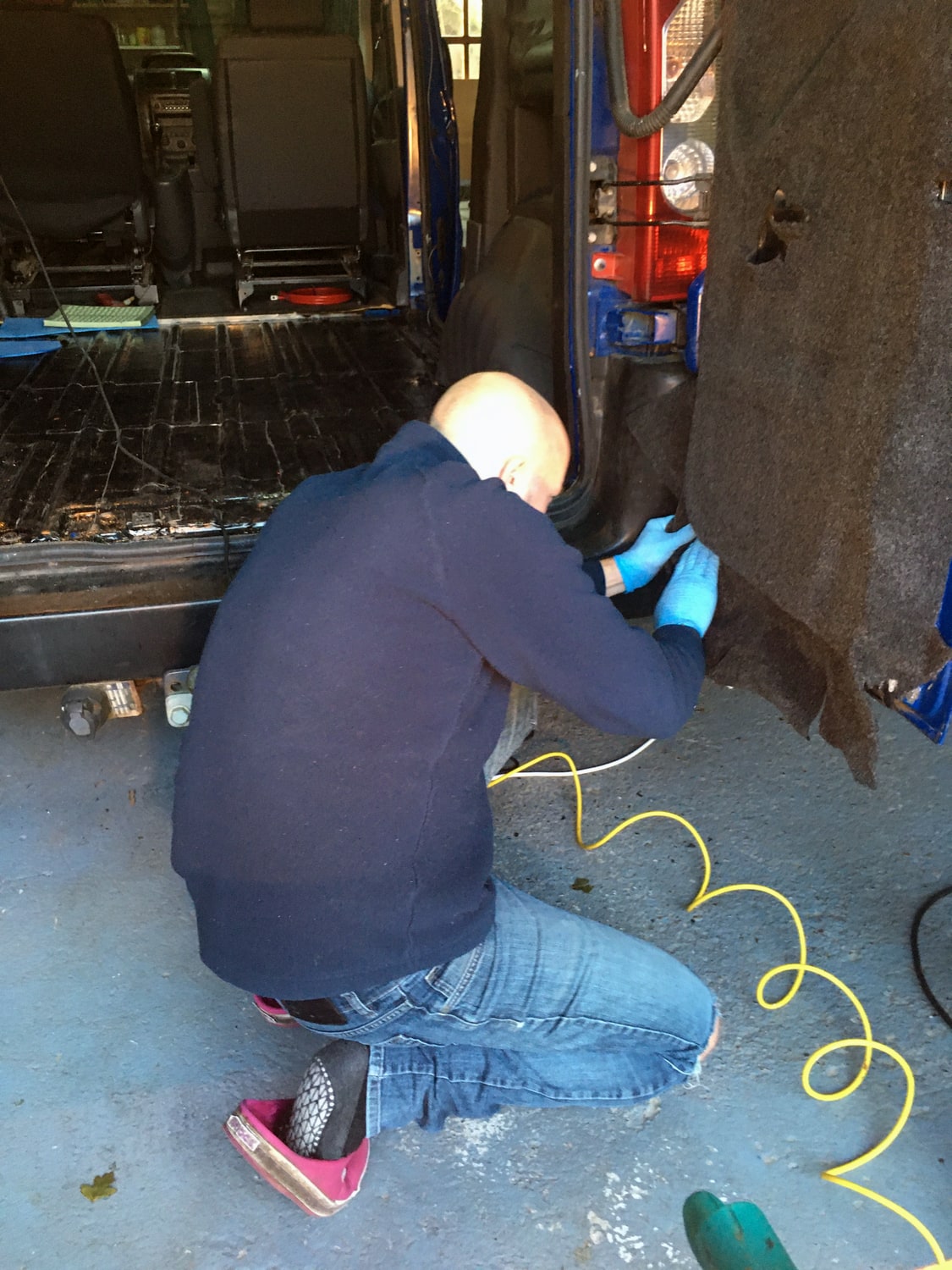 Beschot (platen) en bekleding met elkaar verlijmd. Gelukkig legt de eerder genoemde video dat ook goed uit. Heb gekozen voor twee verschillende diktes qua platen. Voor de grote oppervlaktes 6mm dik en voor de kleine 3. Samen met mijn vader vastgezet met zelftappers aan de auto. Het ziet er goed uit. Net alsof de fabrikant het zo bedoeld heeft.