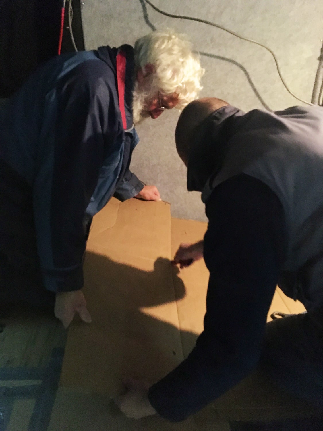 Mallen gemaakt met karton voor al het plaatmateriaal dat er weer op komt. Achter die panelen zitten vaak stroomdraden of andere zaken waar je later nog bij moet willen kunnen. Al het plaatmateriaal gekocht en grofweg op maat laten zagen. Ook ervoor gekozen om de oude vloer er weer in te leggen en te hergebruiken ipv nieuw plaatmateriaal. Scheelt weer 150 euro en er komt toch weer zeil overheen. Na wat bijzagen (door isolatiemateriaal zijn de maten wat veranderd) paste het net. Later moet het nog weer even beter maar voor nu oké.
