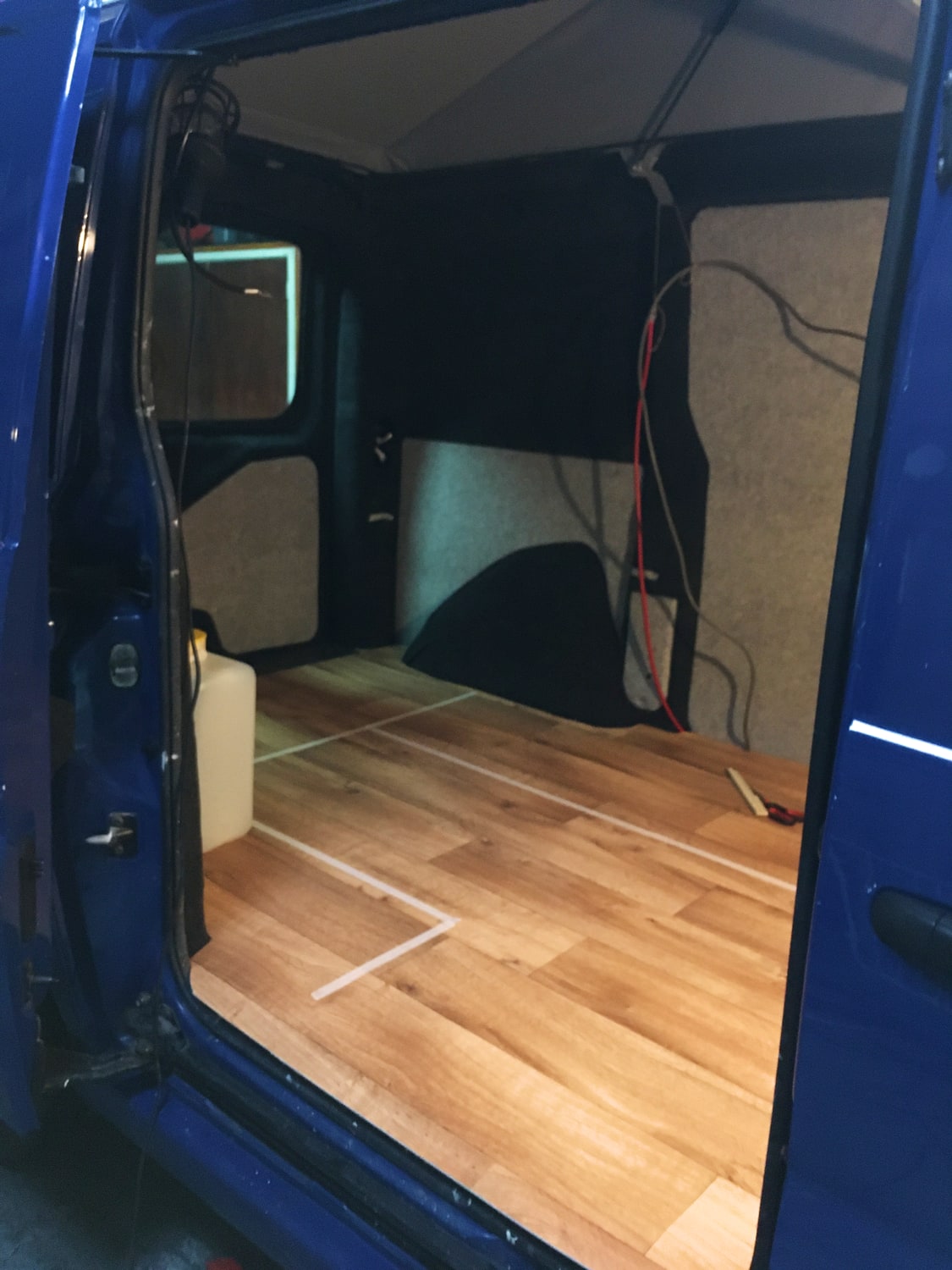 Ons nep houten vloertje komt erop die we bij de leenbakker hadden gekocht. Dus weer tijd om mallen te maken van karton en dan uit te snijden. En dan zo dat de “planken” netjes in de lengterichting liggen en natuurlijk niet scheef. Echt een duidelijke richtlijn of rechte hoek waarop je kunt leggen is er in de auto niet dus best ingewikkeld, maar het is gelukt en het ziet er beter uit dan ik ooit had durven hopen. Vereende krachten maken veel mogelijk.