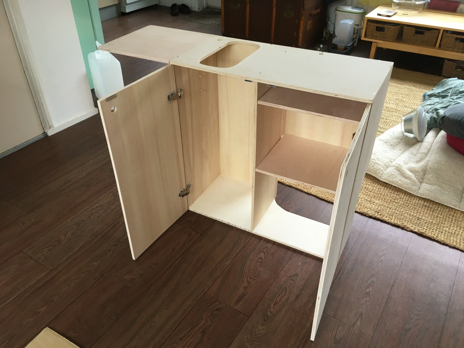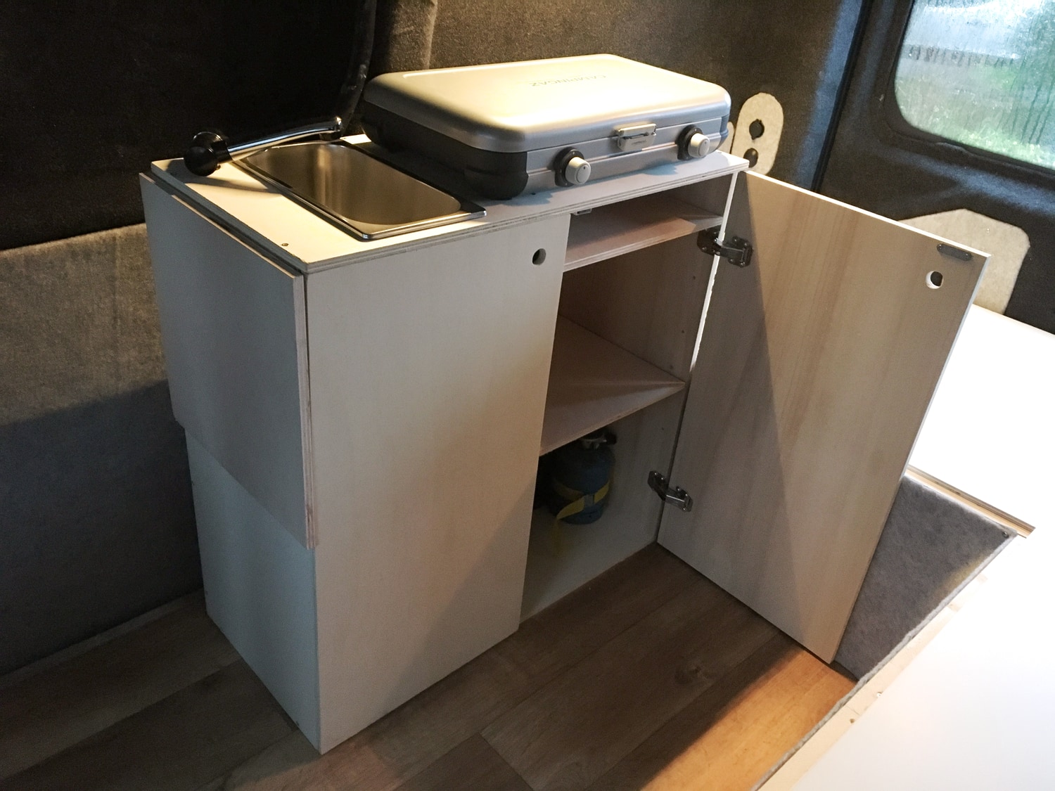 Nu het keukenblok echt afmaken zodat het goed is voor de keuring. Dus definitieve indeling + deuren + alles vastzetten en installeren. Daarvoor moet hij eerst weer uit de bus en dus losgeschroefd worden van de vloer en de bank. Het was echt een monsterklus van bijna 2 dagen om alles netjes te krijgen. Ook omdat de deuren krom waren en de scharnieren zich moeilijk lieten afstellen.