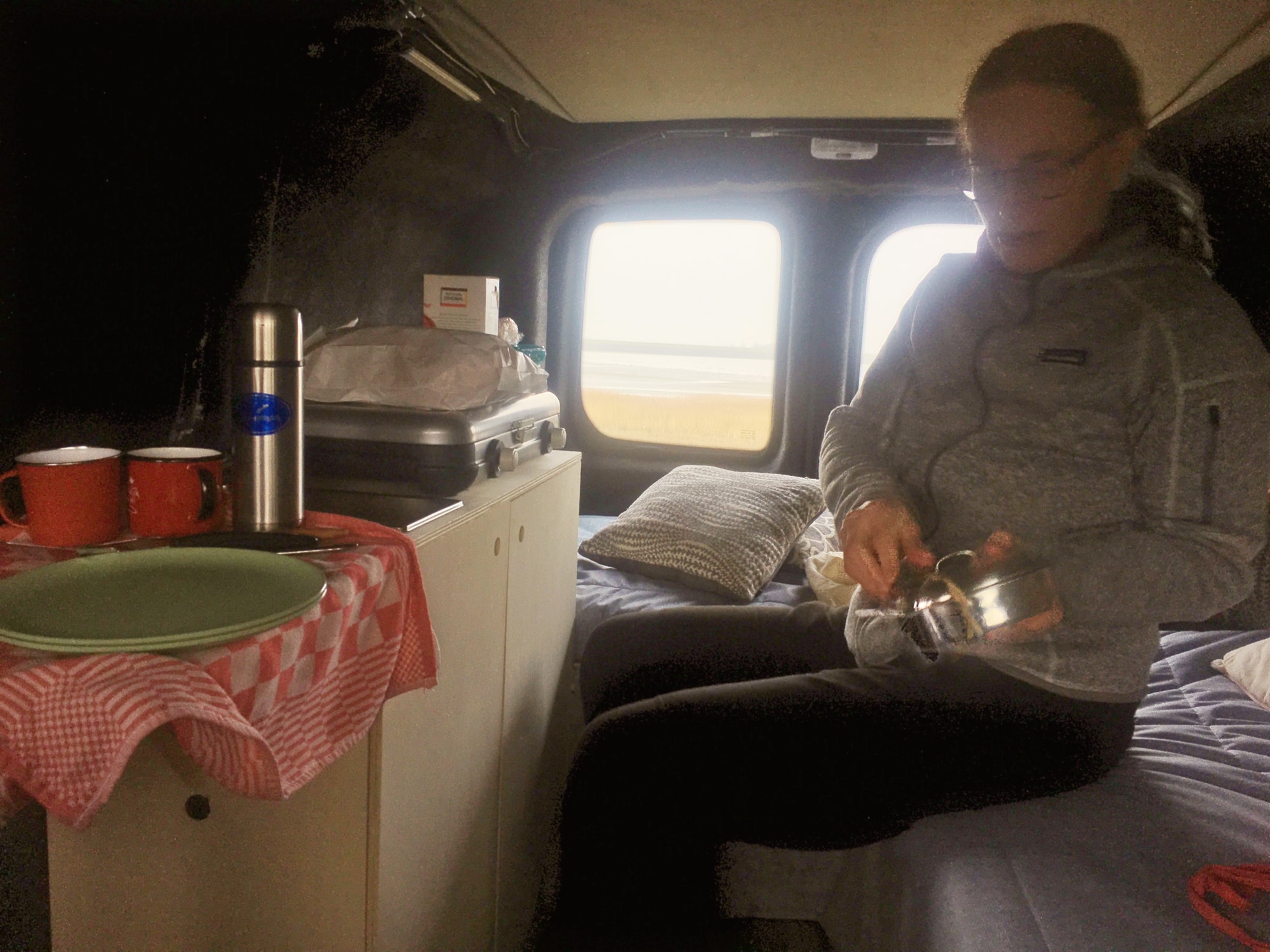 Een IRL mockup in de auto gemaakt met een kartonnen keukenmeubel en twee stukken meubel uit huis. Uittekenen werkt maar tot een bepaald punt. Om echt een goed gevoel te krijgen van wat er in de bus past moet je dit gewoon maken.