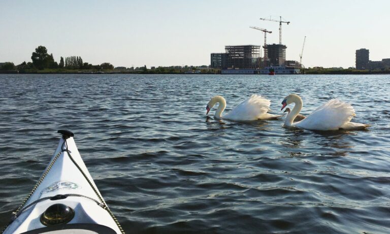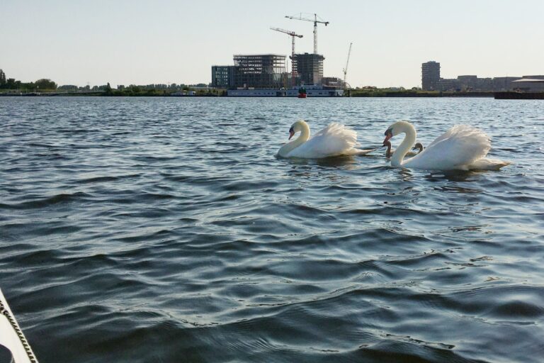 Gister ging niet zo lekker dus vandaag in de herkansing. Weer wat aanpassingen gedaan en om 8 uur zat ik op het water. En had me voorgenomen om ’t IJ af te varen. Voordat ik het grote water bereikte kwam ik de familie Zwaan tegen.