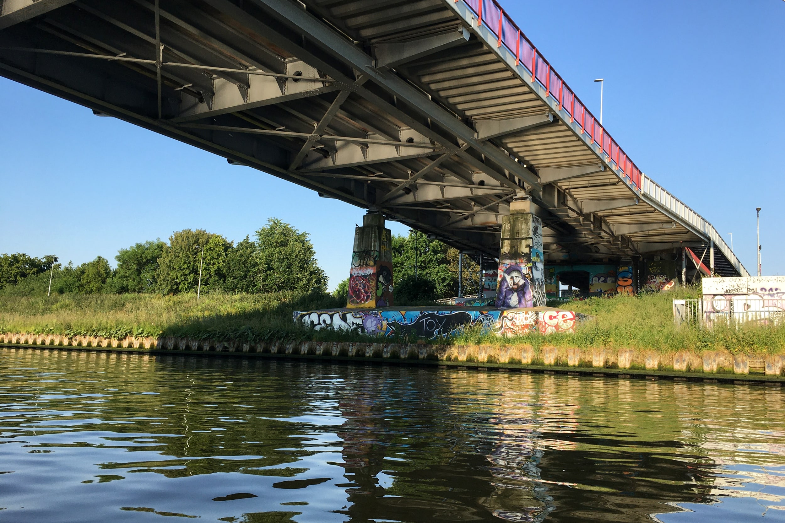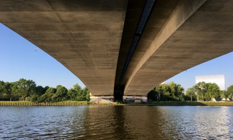Dat lukte behoorlijk. Het Amsterdam Rijnkanaal had ik bijna voor me alleen, lekker in het midden gevaren en de lage zon verlichte de bruggen mooi.