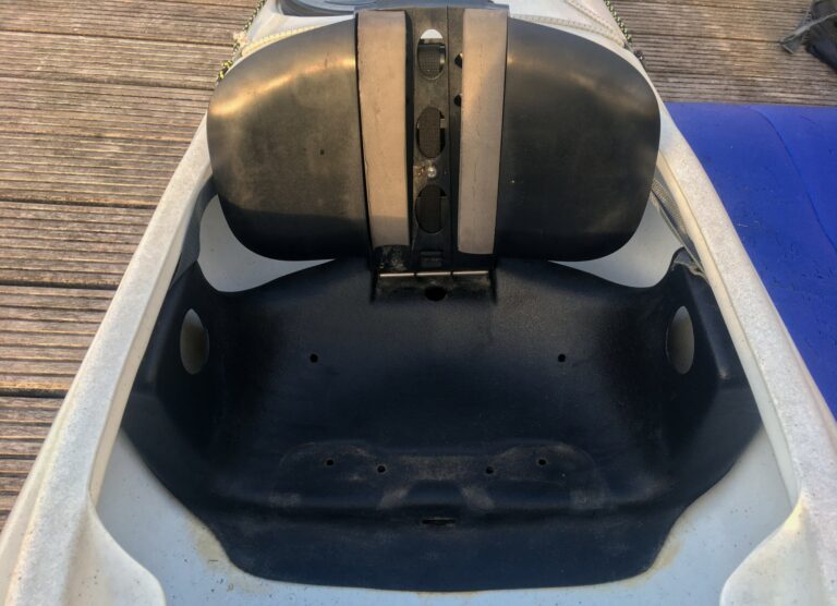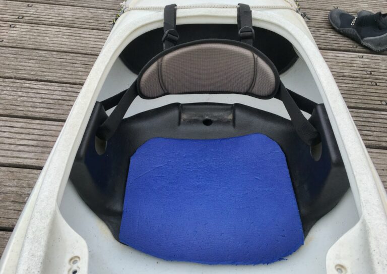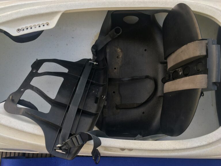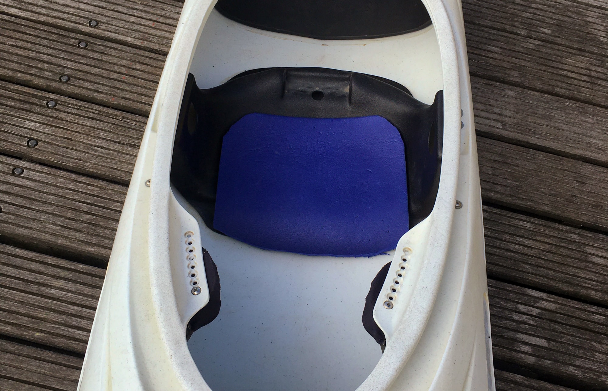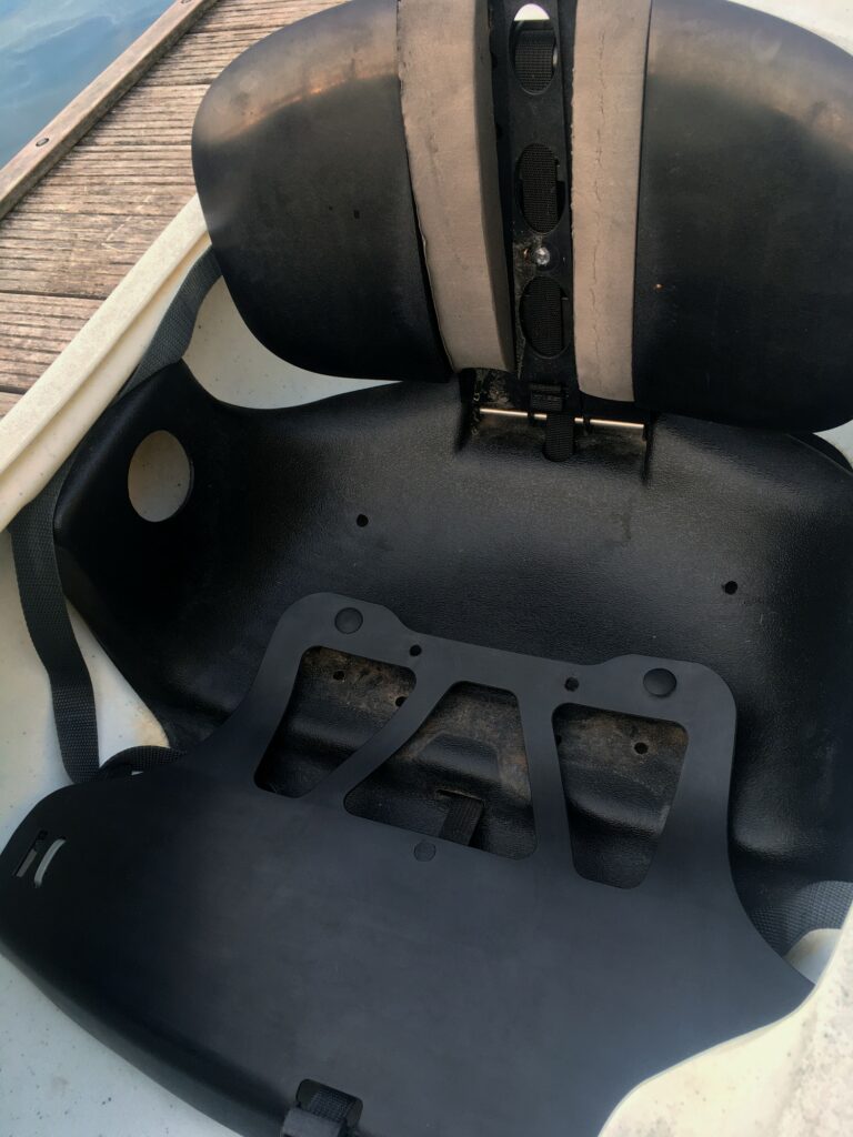 In mijn nieuwe kajak zit zat een luxe fauteuil. Aan de voorkant zat een steun die je omhoog kon zetten voor de benen en de rugsteun was naar boven en onder te verstellen. Maar het deel van de benen gebruikte ik gewoon niet en de rugsteun achter kan alleen maar omhoog als je geen spatzeil gebruikt (dat doe ik altijd). De rugsteun drukte daardoor teveel in mijn bekken bij lange afstanden.