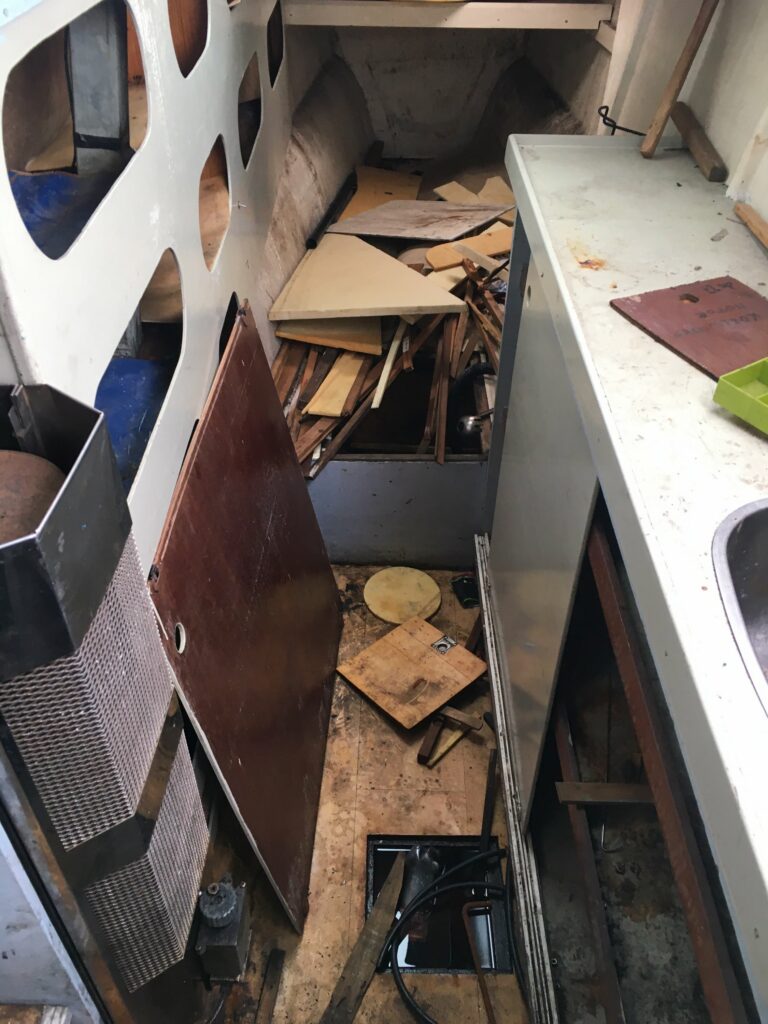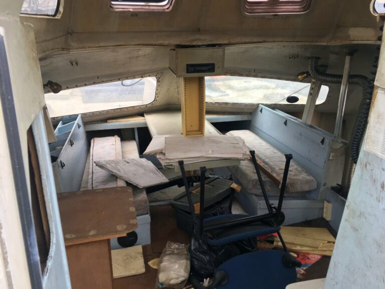 Kan goed door rotzooi heen kijken, als de constructie goed is, is dit een geweldige boot. In zijn vorige leven was het zeker een serieuze zeilboot voor op de oceanen. Als mijn bootje zou het een tamme binnenvaarder/huisboot worden zonder dat de wind ‘m op z’n zij zou kunnen tillen. Geen woeste golven meer. Kalm varend op een licht briesje en zonne-energie. Zou er ook wat meer kajuit op bouwen en bewoonbaar maken voor in de winter.