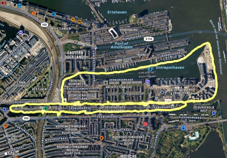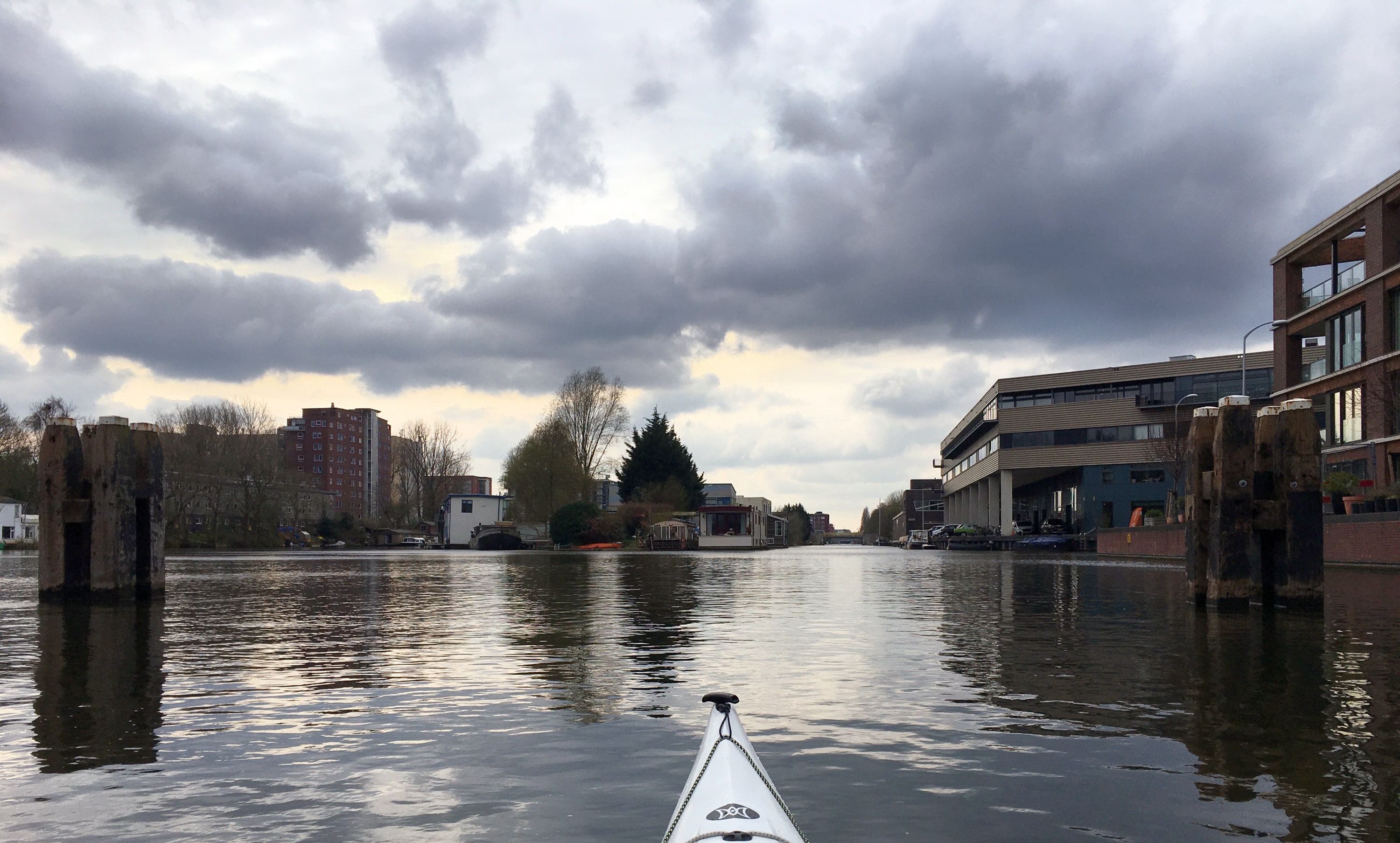 Tweede rondje door de Entrepothaven. Maar na twee kilometer merkte ik dat het ‘m nog steeds niet was. Doordat ik de steuntjes dichterbij had gezet duwde ik mezelf ook meer achter in de stoel/kuip. Waardoor ik tegen de rand aan kwam. Niet goed.
