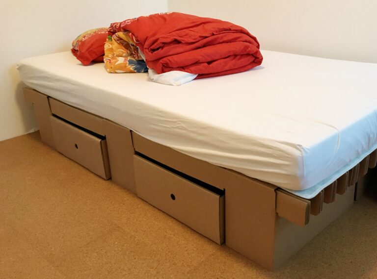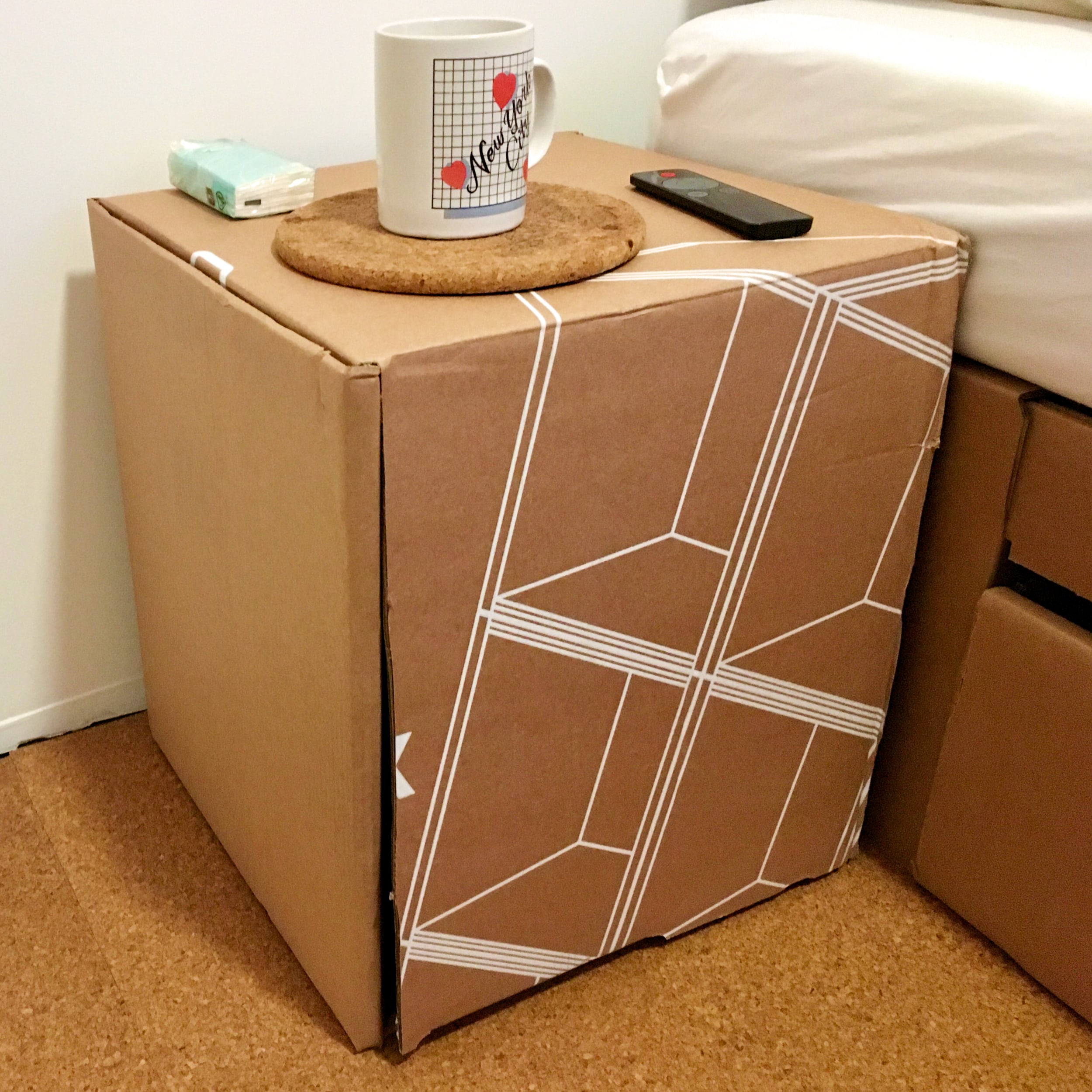 Van de doos waarin de ladekasten kwamen heb ik nog een kastje geknutseld voor bij het bed. Zonde om goed karton weg te gooien. Heb hun methode om stevigheid te creëren gekopieerd en werkte perfect. Binnenin nog meer ruimte om ooit te gebruiken.