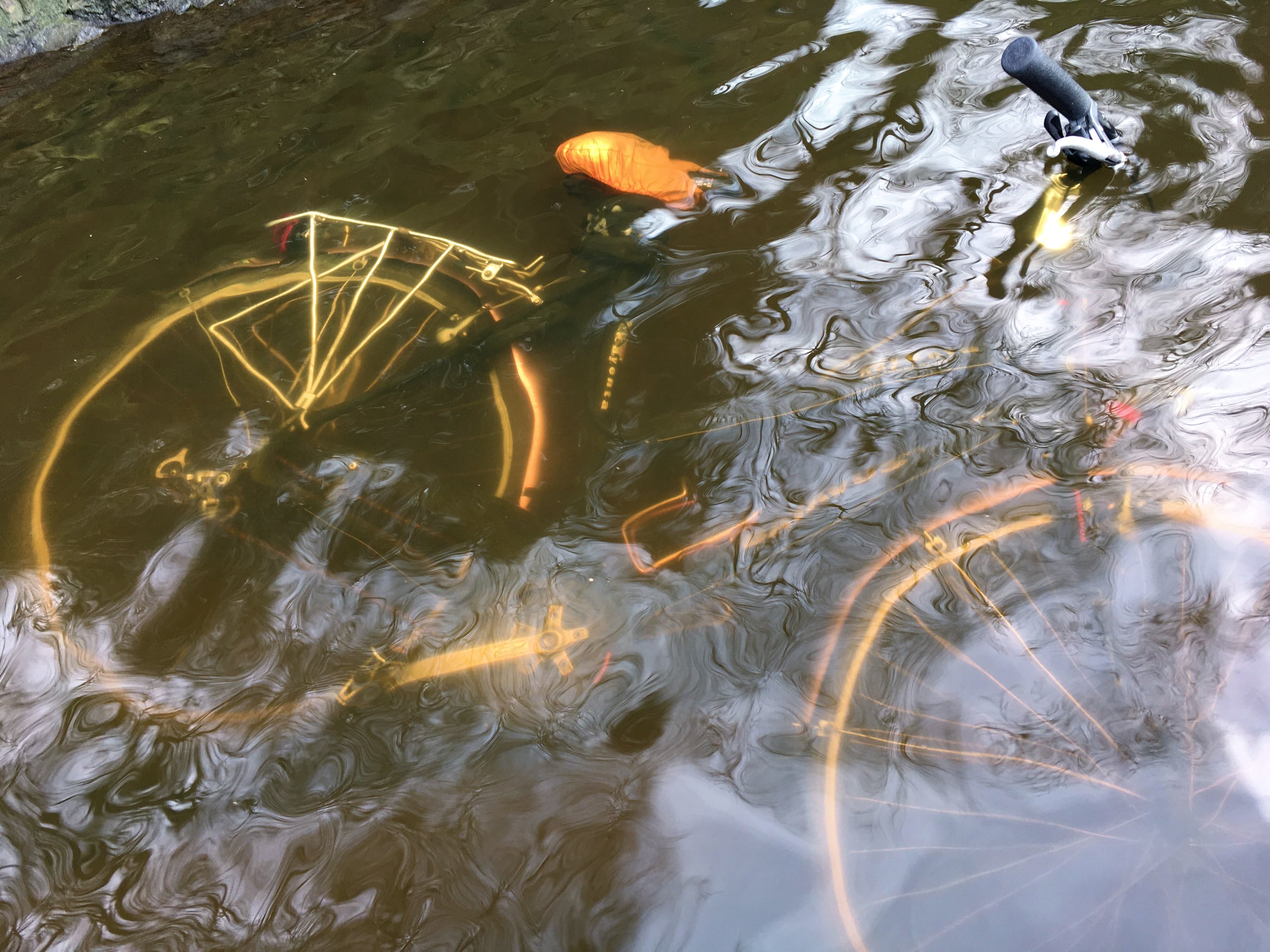 Bij Artis stak een stukje handvat boven het water uit. Zat een mooie fiets aan vast zo vlak bij de kant onder water.