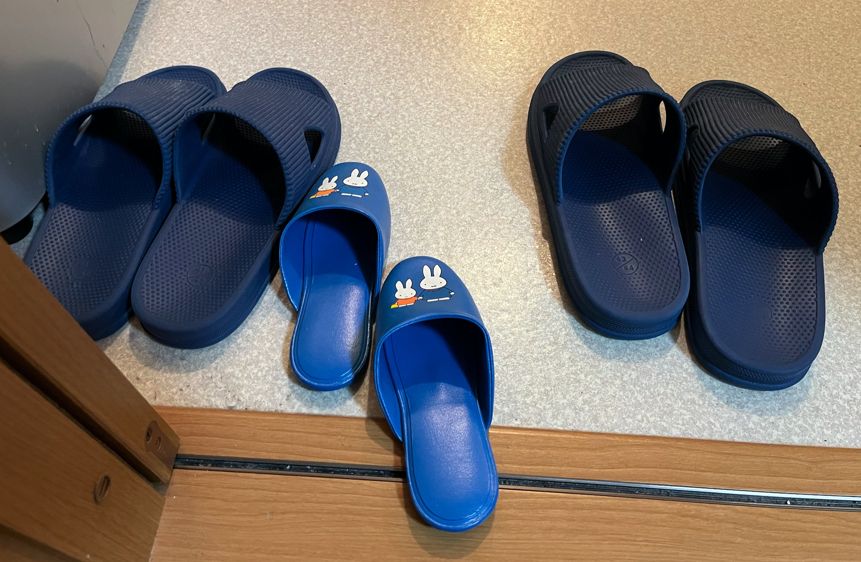 Er is hier een goeie gewoonte. Je trekt je schoenen uit in de portiek voordat je het huis binnen gaat en verruilt deze voor sloffen. Ben je in je kamer dan doe je je sloffen weer uit in de mini portiek van je kamer. Ga je naar de gemeenschappelijke badkamer? Zelf daar ruil je je sloffen om voor badkamersloffen. Is nog zeer wennen, maar vind het geweldig. Ook een mooi ritueel. Het kost meer tijd om een ruimte in te komen en je beweegt je bewuster door een ruimte.