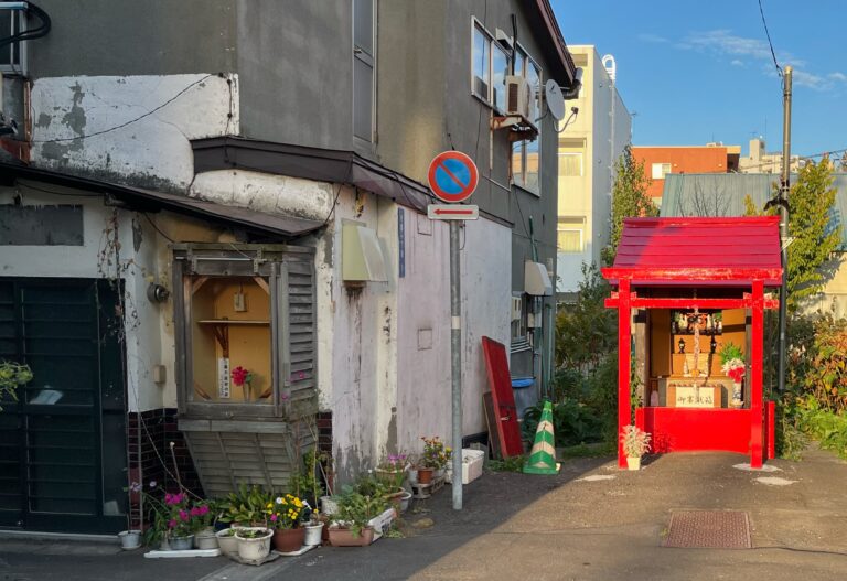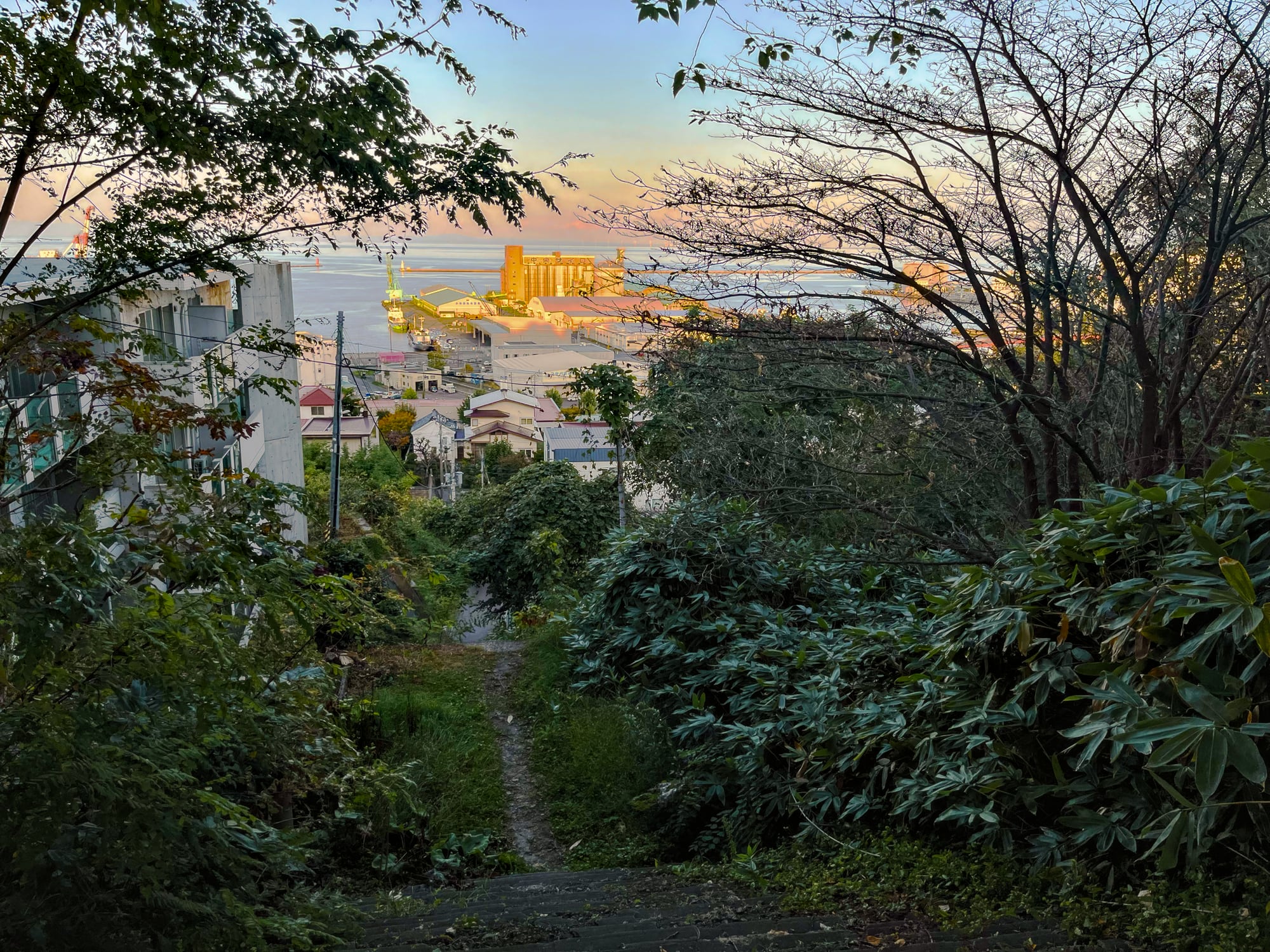 Daarna liep ik tegen een trap aan waar ik uiteindelijk bij de shrine kwam en wat uitzicht had over Otaru. Wel met een saai blokkerend gebouw ervoor. En een niet veel gebruikte trap gevonden die me bijna direct bij mijn slaapplek bracht. Was verbaast hoe dichtbij het was.