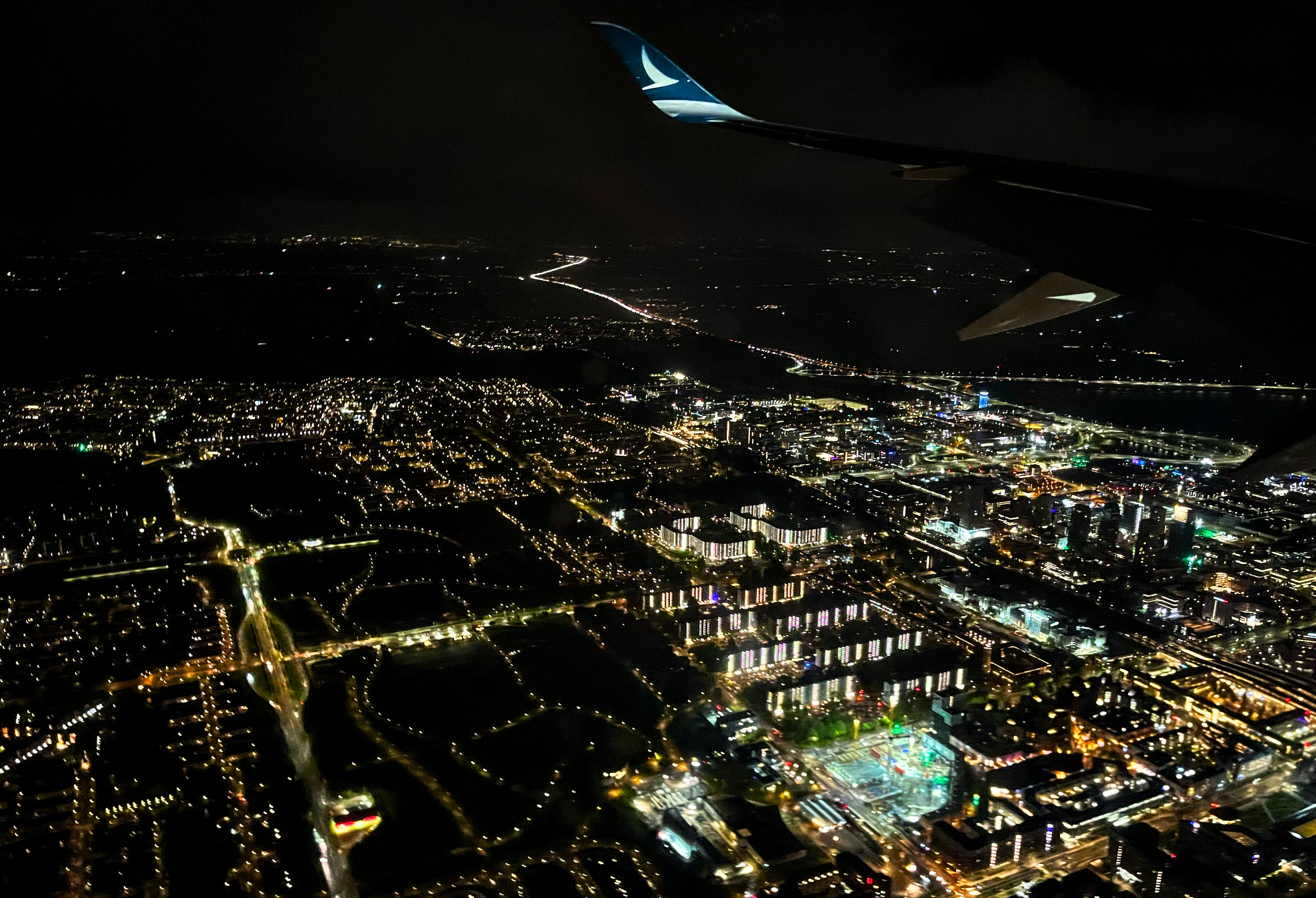 In beide vliegtuigen weer bij het raam. Had me niet gerealiseerd dat we de hele tijd in het donker zouden vliegen. Toch mooie momenten gehad. De lichten rond Osaka waren betoverend, net als de schepen op het water bij Hongkong. Steden als kermissen en basissen op verre planeten. Lichtgevende wolken die als dekens over steden liggen met kleine kiertjes die de stad onthullen. En natuurlijk een prachtige sterrenhemel.