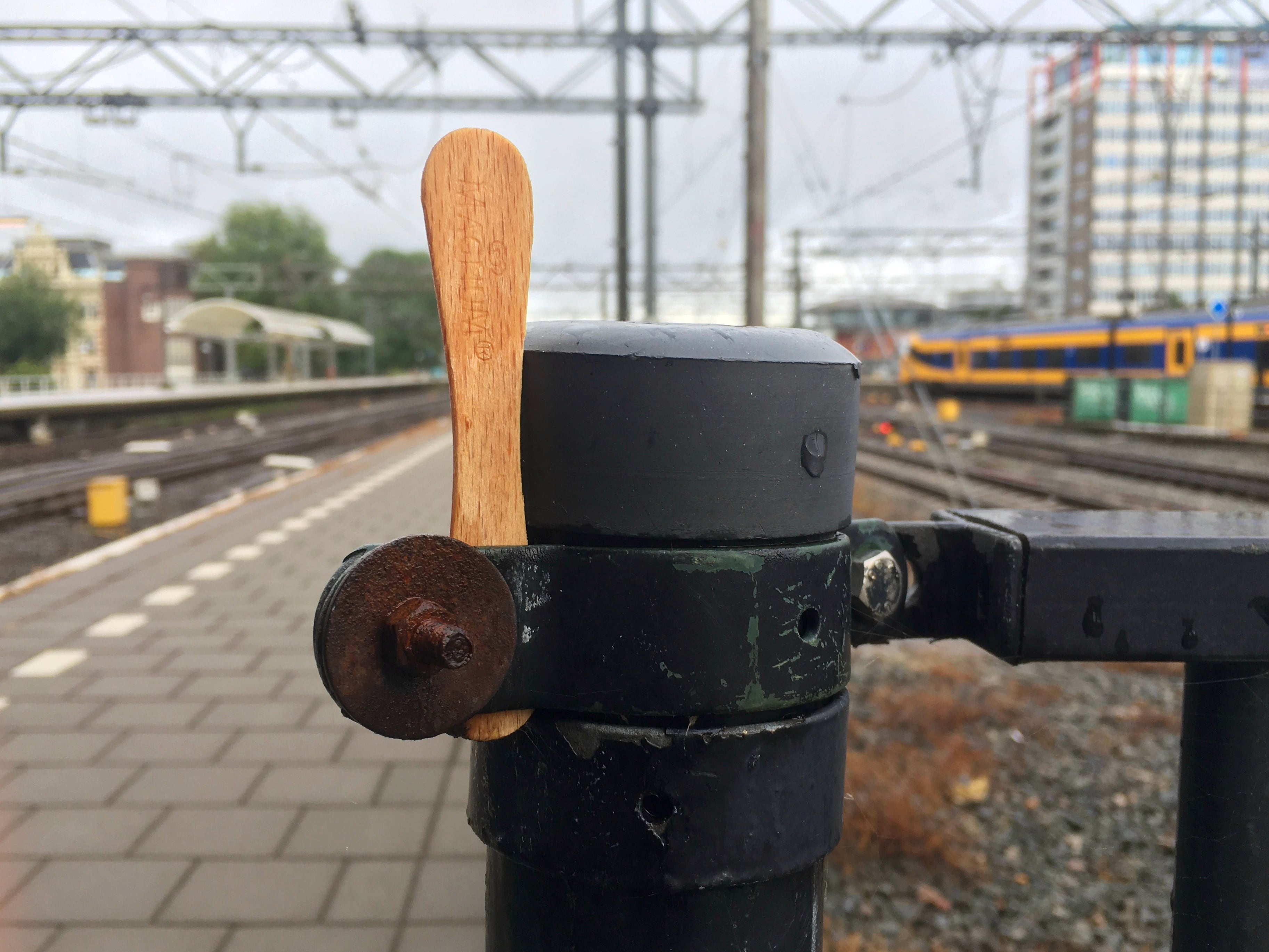 Iemand hield aan het eind van het perron een stokje over. Weggooien is ook zoiets, het verdiende een waardig plekje.