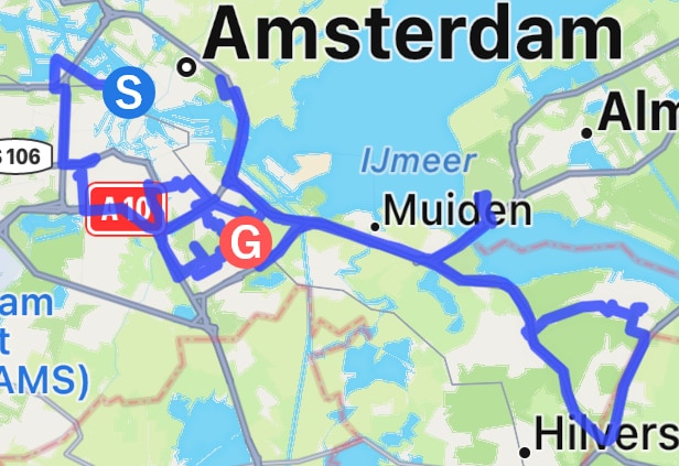 Mijn laatste ritje was naar het Damrak. Maar kwam van de westkant. En dat is (achteraf) echt niet de kant waarop je het wil benaderen. Was op 60 meter van de plek waar ik moest zijn maar kon er niet komen.