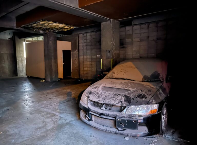 Staat in een garage zonder deuren en wordt langzaam een grot vol met tekeningen.