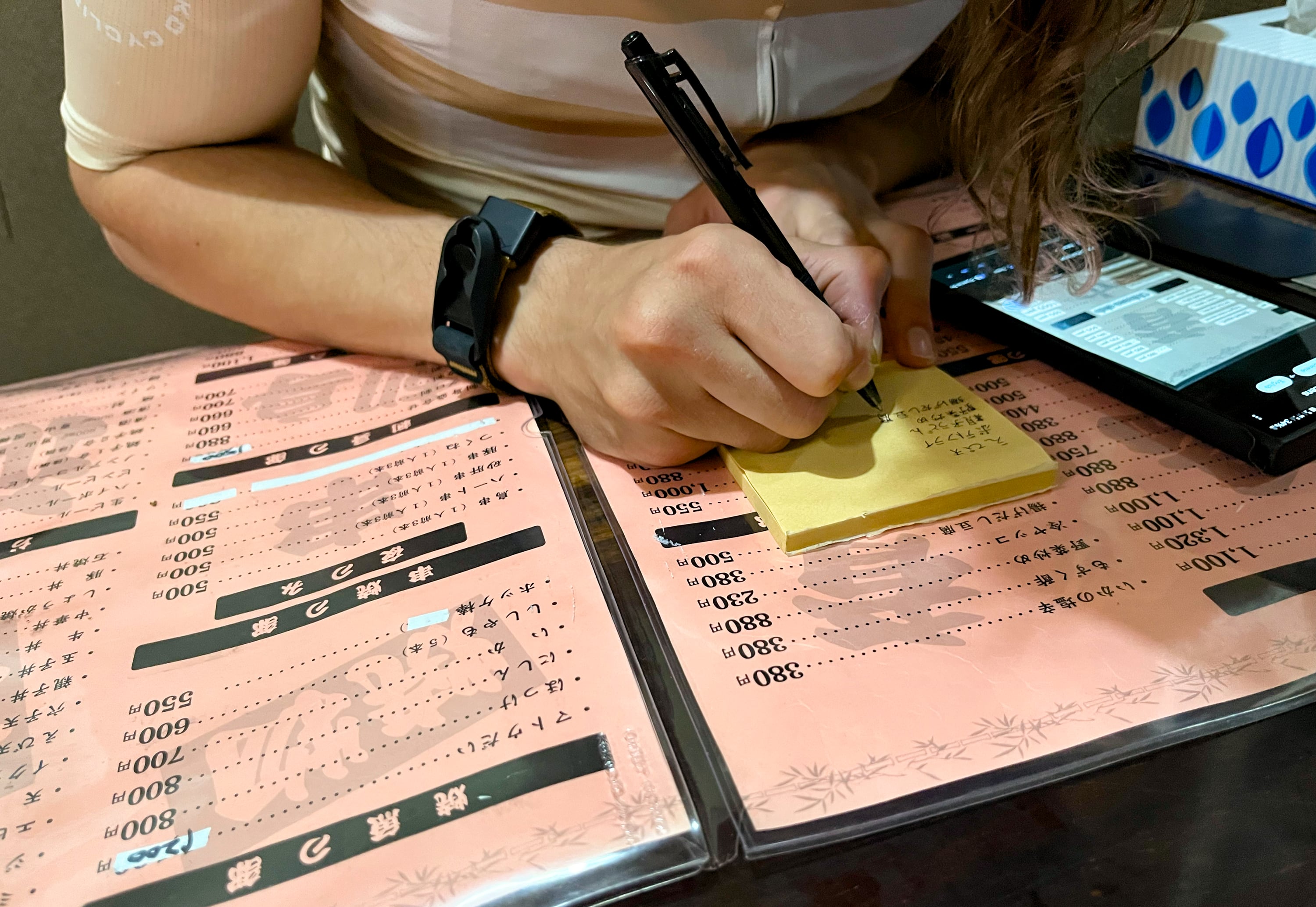 In sommige restaurants is het de gewoonte. Zoonlief doet het gewoon en het eten wat we krijgen is ook nog eens wat hij besteld heeft. Zoals dit (wat zeer lekker was). Weet niet meer welke het van de dingen is die hij op het lijstje aan het schrijven is.