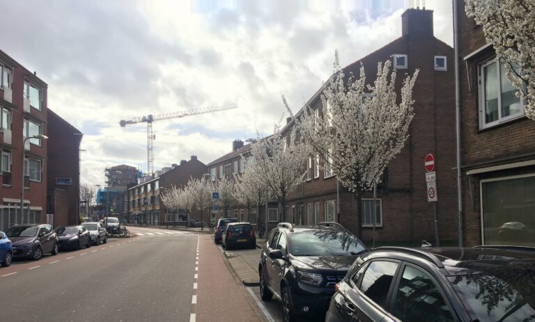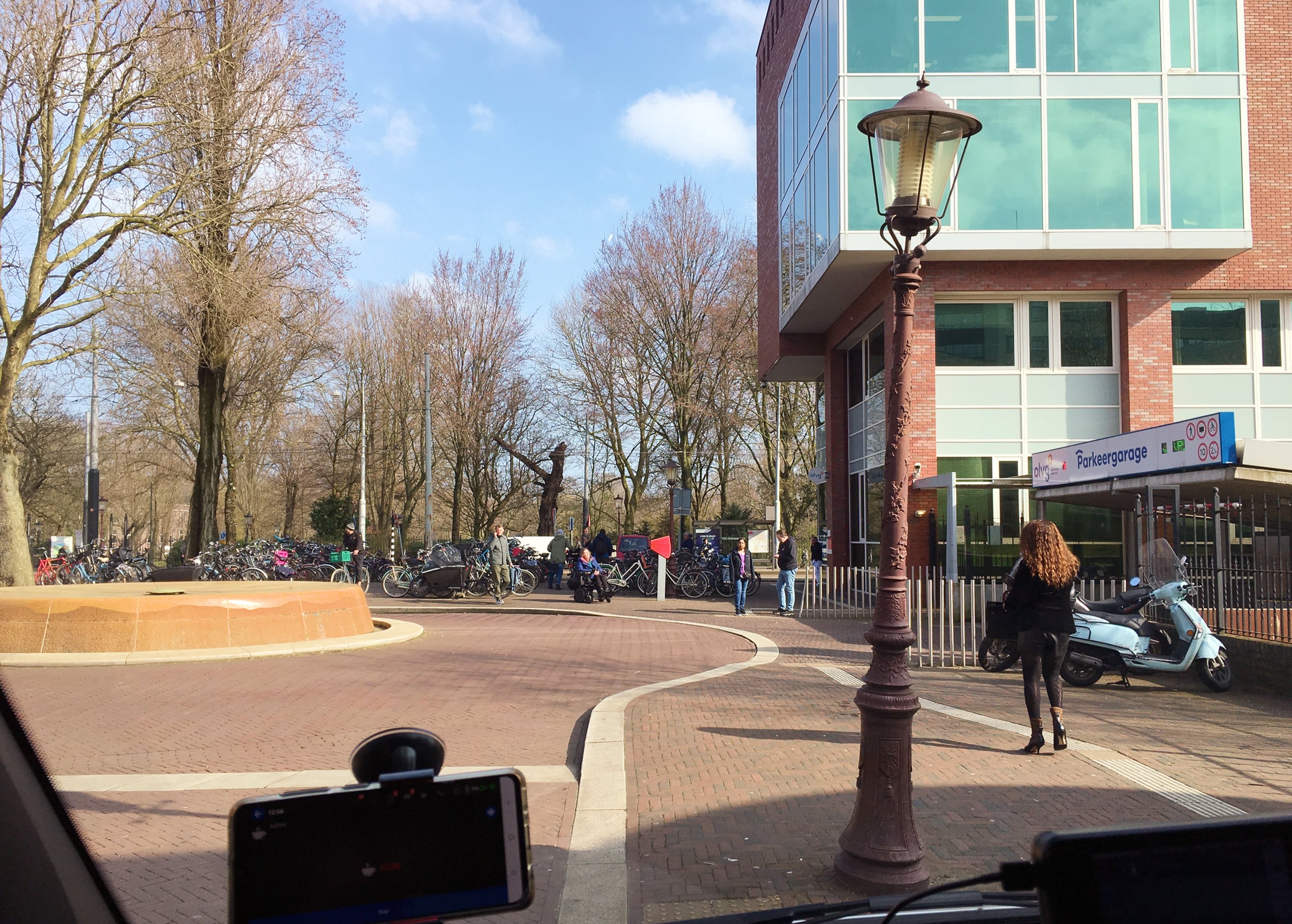 Uitzicht vanuit mijn autoraam met een parkeerplek bij het OLVG in Amsterdam Oost. Heb zie een kleine rotonde en de ingang rechts naar de parkeergarage en een stukje van het ziekenhuisgebouw. Achter de rotonde fietsen en daarachter het Oosterpark. Het is een mooie zonnige dag.