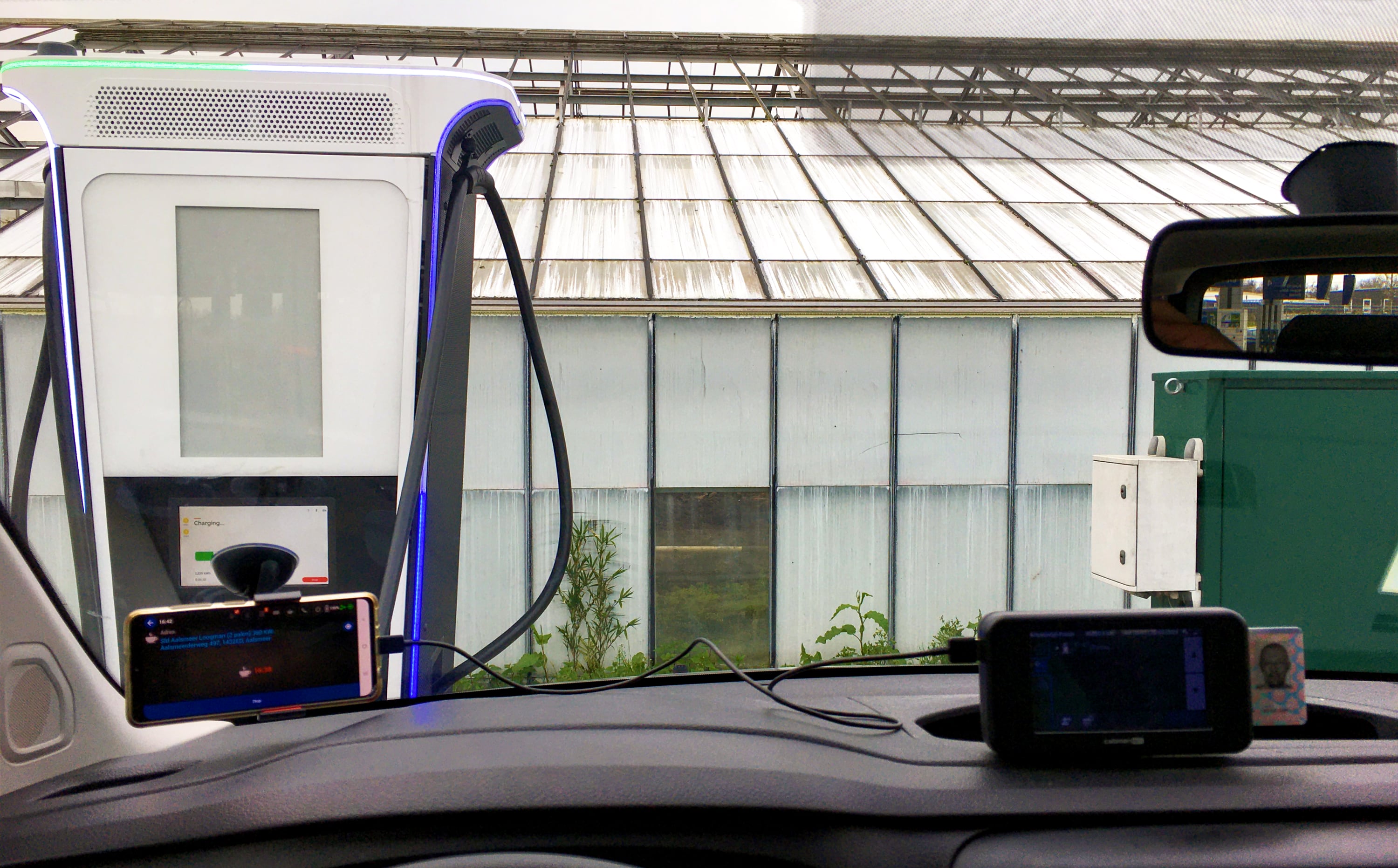 Uitzicht vanuit de voorruit bij een tankstation. Auto staat aan de snellader en ik kijk uit op een kas met melkglas. Waar het glas van het dak nu wordt afgehaald.