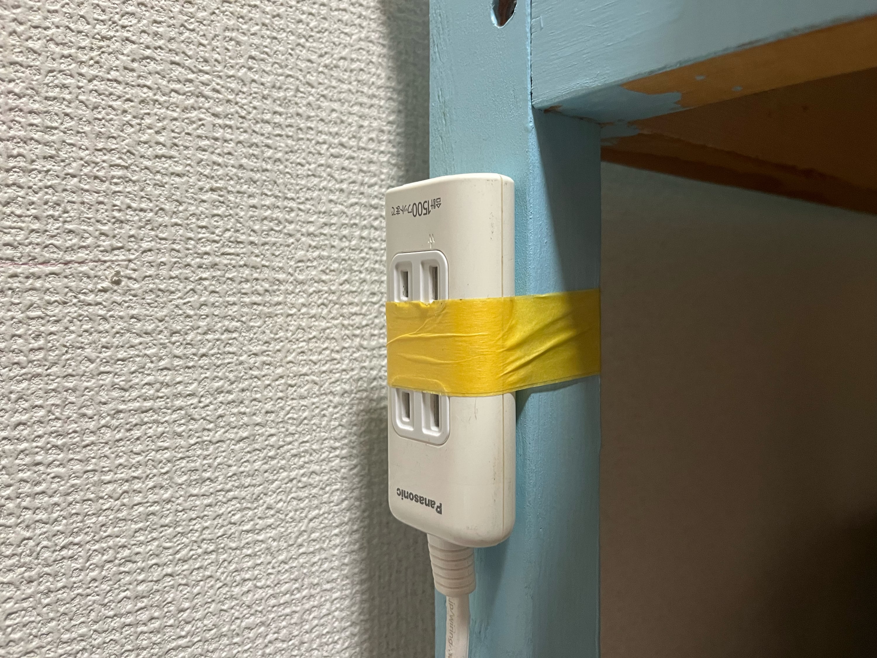De stopcontacten in Japan zijn schattig maar ze zijn ook best onhandig omdat ze niet echt de zware stekkers en adapters vast houden zoals we dat in Nederland gewend zijn. Dus moeten we wat improviseren. De tent is net groot genoeg.